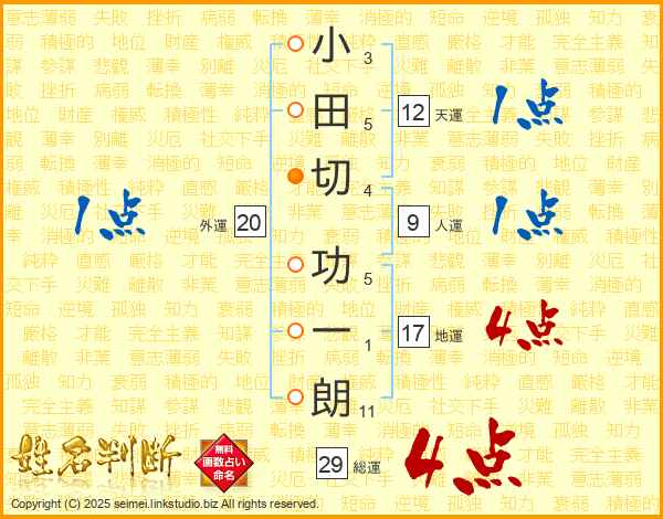 小(3画)田(5画)切(4画) 功(5画)一(1画)朗(11画)
