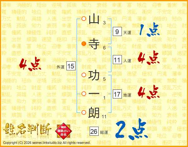 山(3画)寺(6画) 功(5画)一(1画)朗(11画)