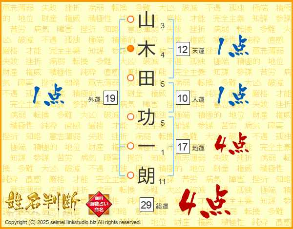 山(3画)木(4画)田(5画) 功(5画)一(1画)朗(11画)