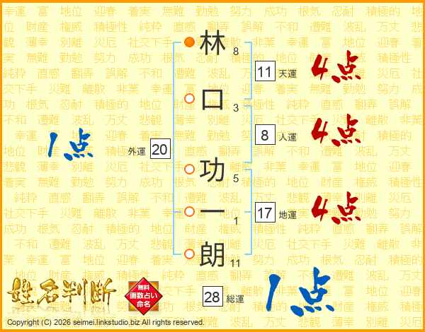 林(8画)口(3画) 功(5画)一(1画)朗(11画)