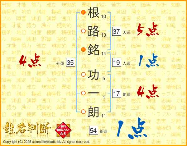 根(10画)路(13画)銘(14画) 功(5画)一(1画)朗(11画)