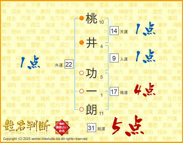 桃(10画)井(4画) 功(5画)一(1画)朗(11画)