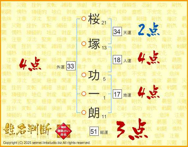 桜(21画)塚(13画) 功(5画)一(1画)朗(11画)