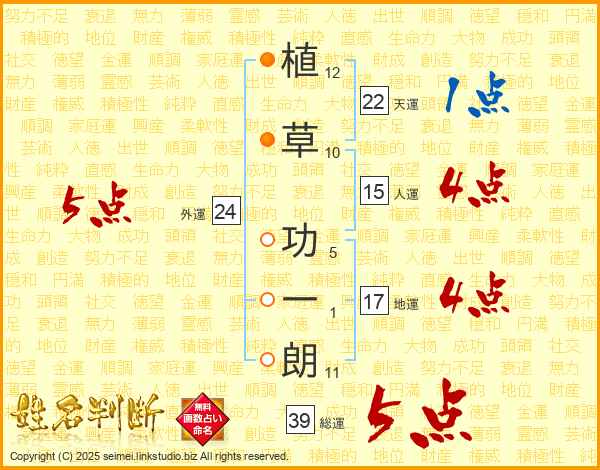 植(12画)草(10画) 功(5画)一(1画)朗(11画)