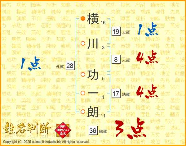 横(16画)川(3画) 功(5画)一(1画)朗(11画)