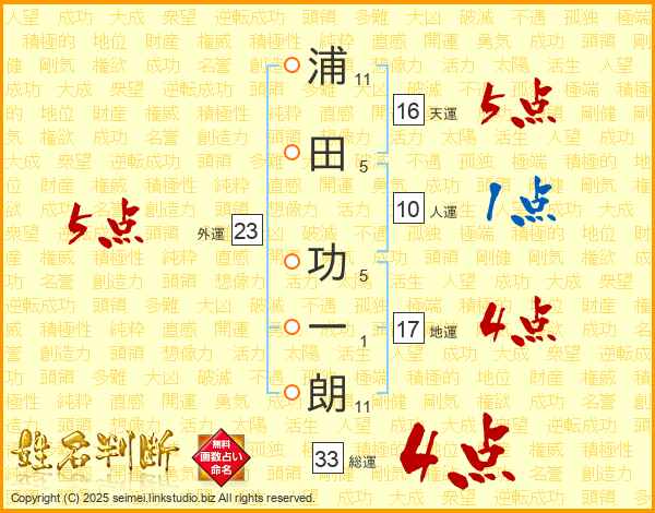 浦(11画)田(5画) 功(5画)一(1画)朗(11画)