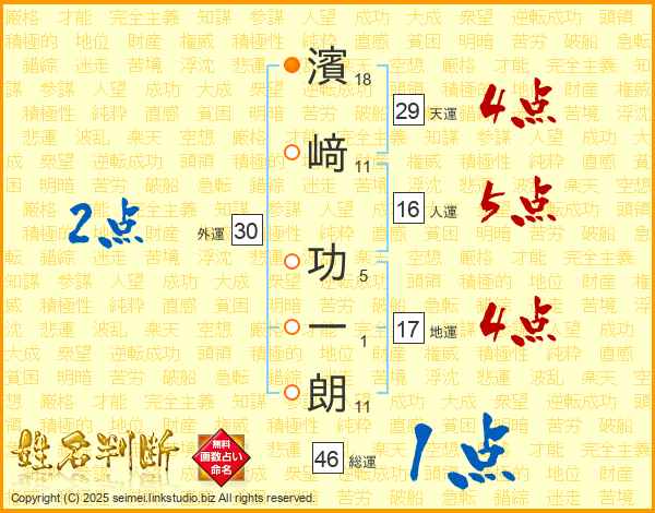 濱(18画)﨑(11画) 功(5画)一(1画)朗(11画)
