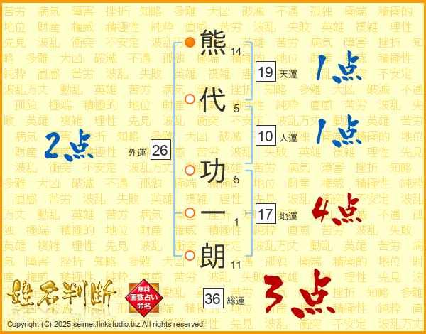 熊(14画)代(5画) 功(5画)一(1画)朗(11画)