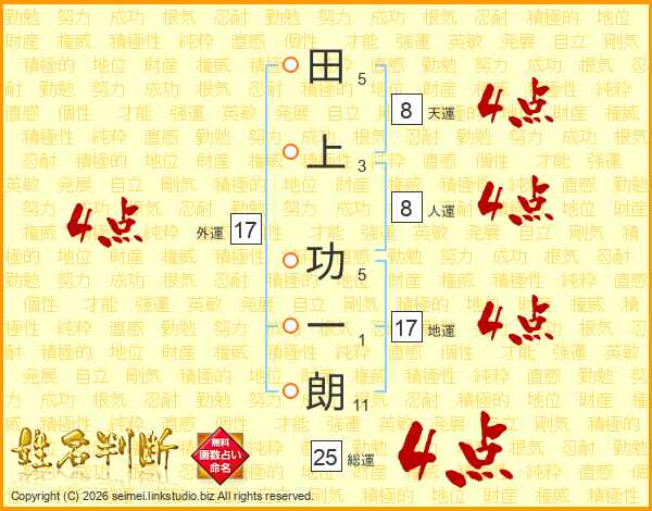 田(5画)上(3画) 功(5画)一(1画)朗(11画)