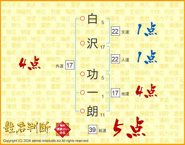 白沢功一朗さんの総運は39画の5点!