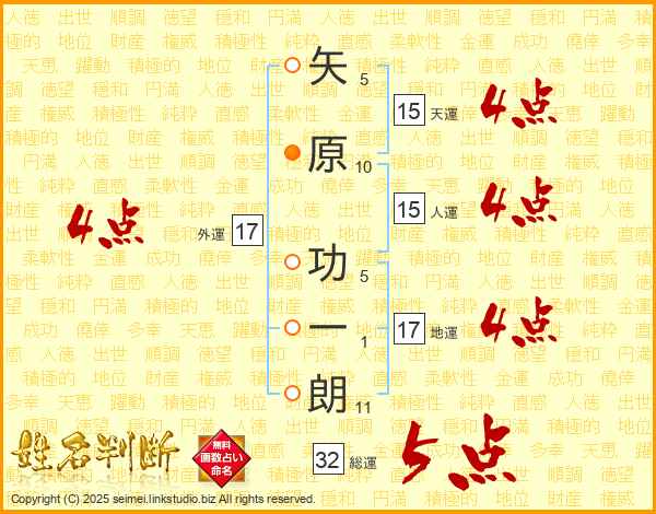 矢(5画)原(10画) 功(5画)一(1画)朗(11画)