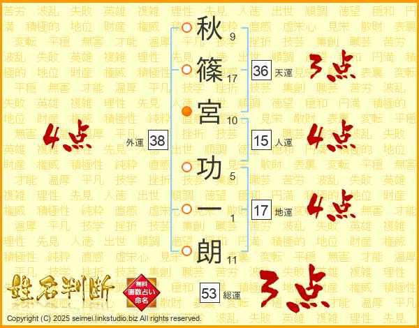 秋(9画)篠(17画)宮(10画) 功(5画)一(1画)朗(11画)