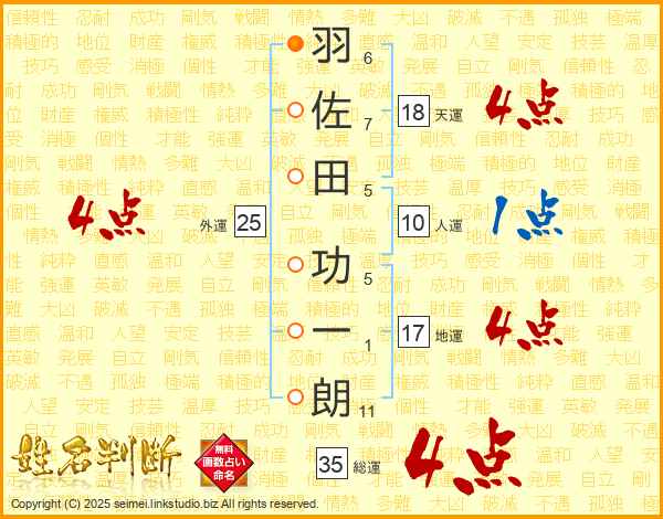 羽(6画)佐(7画)田(5画) 功(5画)一(1画)朗(11画)