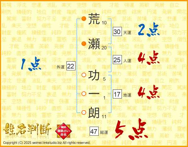 荒(10画)瀬(20画) 功(5画)一(1画)朗(11画)