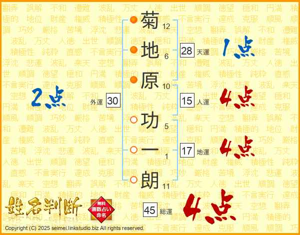 菊(12画)地(6画)原(10画) 功(5画)一(1画)朗(11画)