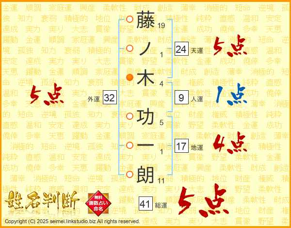 藤(19画)ノ(1画)木(4画) 功(5画)一(1画)朗(11画)