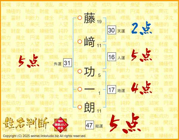 藤(19画)﨑(11画) 功(5画)一(1画)朗(11画)