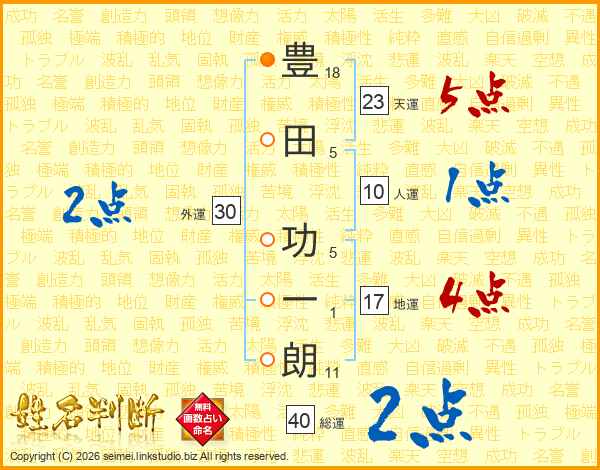 豊(18画)田(5画) 功(5画)一(1画)朗(11画)