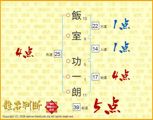 飯(13画)室(9画) 功(5画)一(1画)朗(11画)