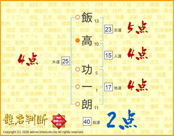 飯(13画)高(10画) 功(5画)一(1画)朗(11画)