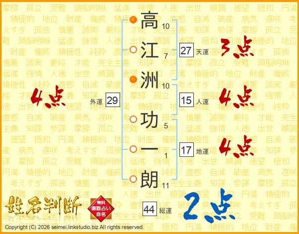 高(10画)江(7画)洲(10画) 功(5画)一(1画)朗(11画)