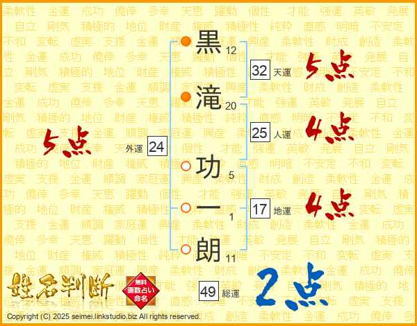 黒(12画)滝(20画) 功(5画)一(1画)朗(11画)