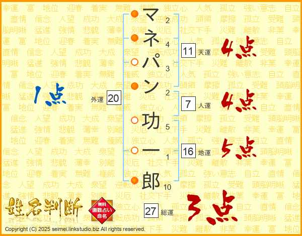 マ(2画)ネ(4画)パ(3画)ン(2画) 功(5画)一(1画)郎(10画)
