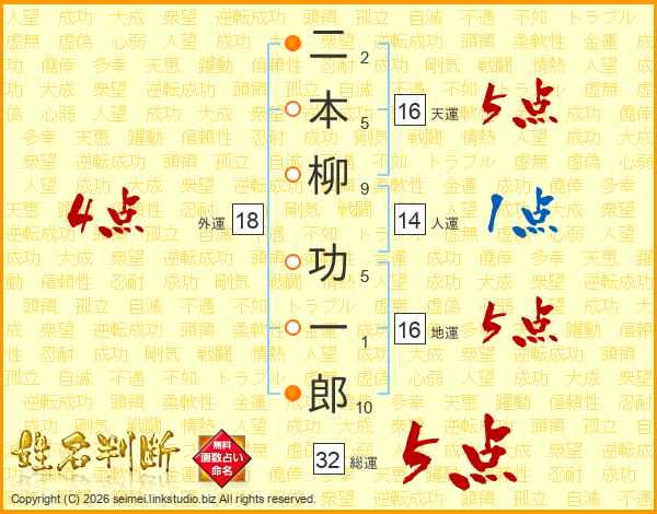 二(2画)本(5画)柳(9画) 功(5画)一(1画)郎(10画)