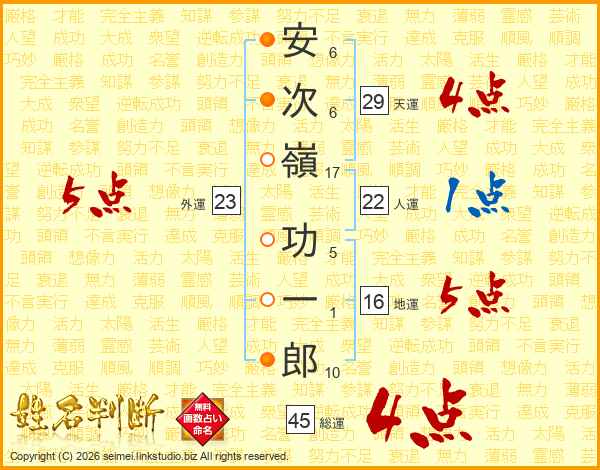 安(6画)次(6画)嶺(17画) 功(5画)一(1画)郎(10画)