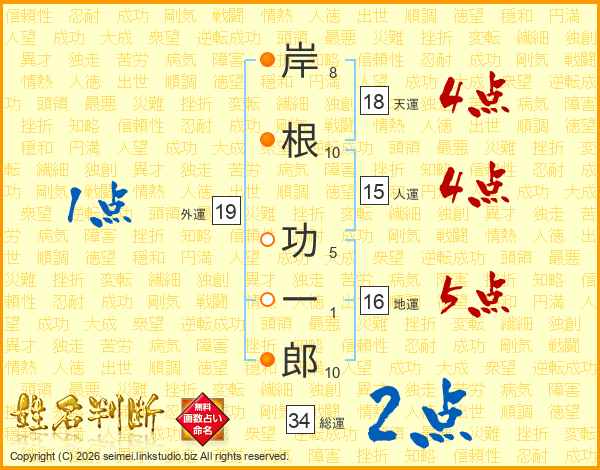 岸(8画)根(10画) 功(5画)一(1画)郎(10画)