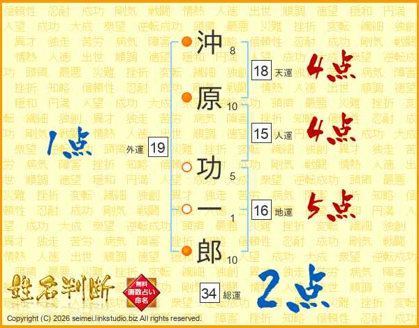 沖(8画)原(10画) 功(5画)一(1画)郎(10画)