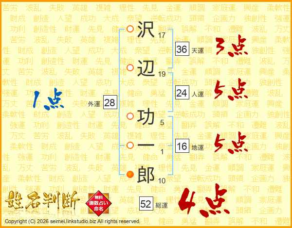 沢(17画)辺(19画) 功(5画)一(1画)郎(10画)