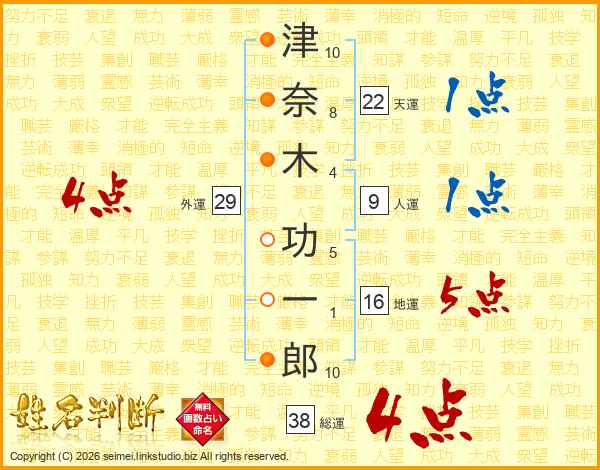 津(10画)奈(8画)木(4画) 功(5画)一(1画)郎(10画)