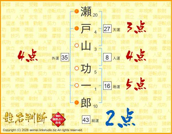 瀬(20画)戸(4画)山(3画) 功(5画)一(1画)郎(10画)