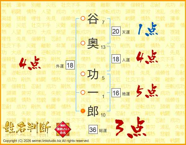 谷奥功一郎さんの総運は36画の3点!