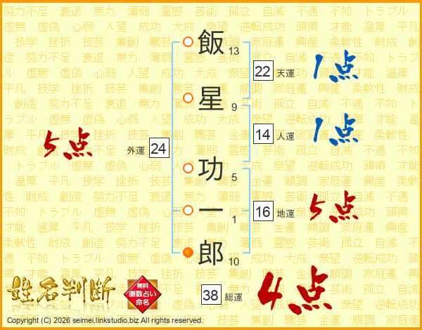 飯(13画)星(9画) 功(5画)一(1画)郎(10画)