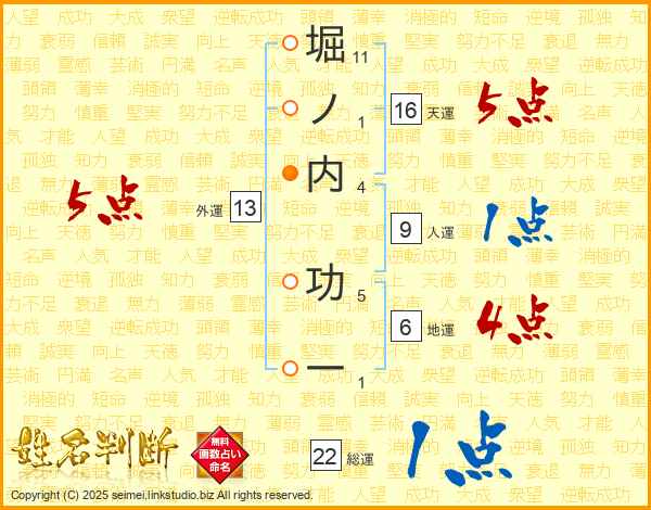 堀(11画)ノ(1画)内(4画) 功(5画)一(1画)
