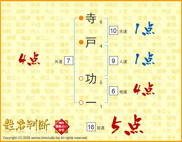 生活面を象徴する運勢です。外部から受ける影響力を表し、結婚運、家庭運や職場、環境への順応性を表します。総運から人運を引いた画数。姓や名が1文字の場合を除く。