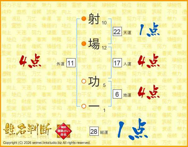 生活面を象徴する運勢です。外部から受ける影響力を表し、結婚運、家庭運や職場、環境への順応性を表します。総運から人運を引いた画数。姓や名が1文字の場合を除く。