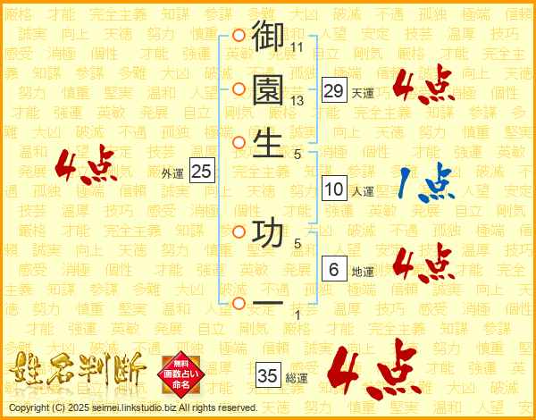 御(11画)園(13画)生(5画) 功(5画)一(1画)