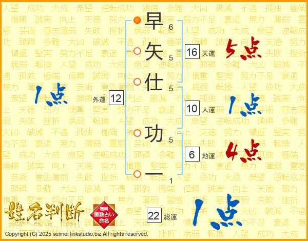 生活面を象徴する運勢です。外部から受ける影響力を表し、結婚運、家庭運や職場、環境への順応性を表します。総運から人運を引いた画数。姓や名が1文字の場合を除く。