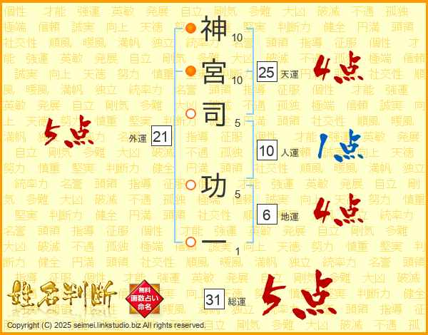 神(10画)宮(10画)司(5画) 功(5画)一(1画)