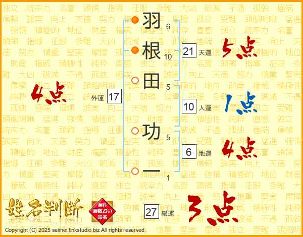 羽(6画)根(10画)田(5画) 功(5画)一(1画)