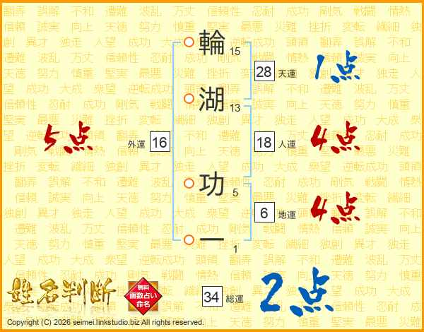 生活面を象徴する運勢です。外部から受ける影響力を表し、結婚運、家庭運や職場、環境への順応性を表します。総運から人運を引いた画数。姓や名が1文字の場合を除く。