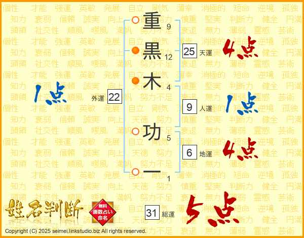 重(9画)黒(12画)木(4画) 功(5画)一(1画)