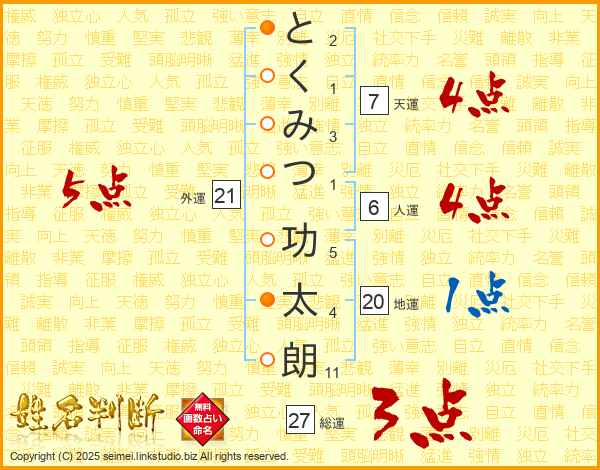 と(2画)く(1画)み(3画)つ(1画) 功(5画)太(4画)朗(11画)