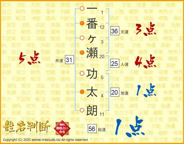 一番ヶ瀬功太朗さんの総運は56画の1点!