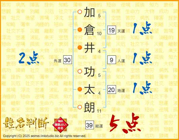 加(5画)倉(10画)井(4画) 功(5画)太(4画)朗(11画)