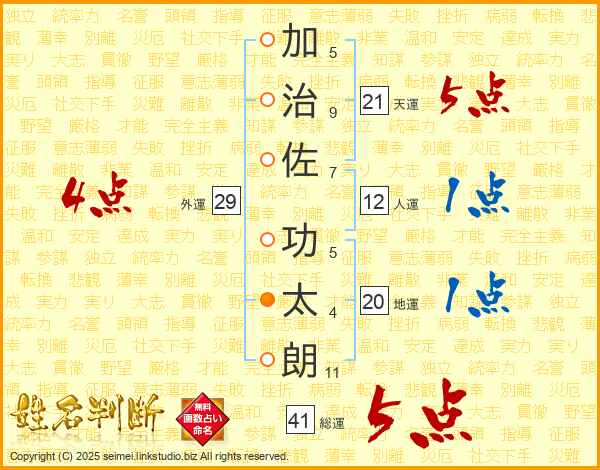 加(5画)治(9画)佐(7画) 功(5画)太(4画)朗(11画)
