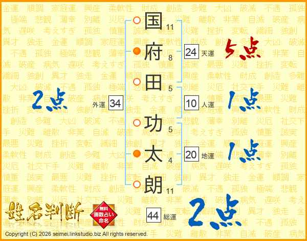 国(11画)府(8画)田(5画) 功(5画)太(4画)朗(11画)